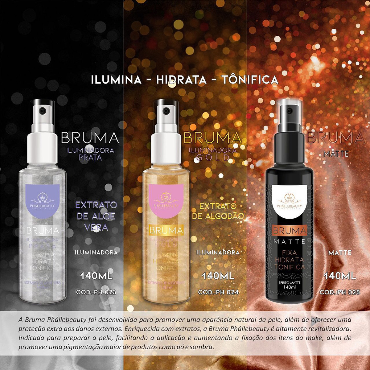 A Bruma Iluminadora Gold foi desenvolvida para Irradiar brilho, promover uma aparência natural da pele, além de oferecer uma proteção extra aos danos externos. Enriquecida com extrato de Algodão, a Bruma Iluminadora Gold oferece ação altamente revitalizadora. Indicada para preparar a pele, facilitando a aplicação e aumentando a fixação dos itens da make, além de promover uma pigmentação maior de produtos como pó e sombra.